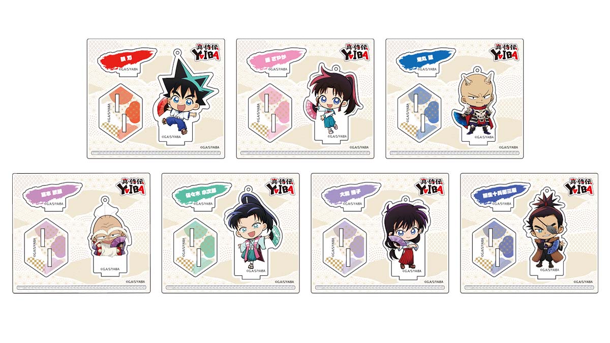 「イメージカラーの扇子を持ったキャラクターたち」をコンセプトに描き起こされた鉄 刃、峰 さやか、鬼丸 猛、宮本 武蔵、佐々木 小次郎、大和 撫子、柳生十兵衛三厳の雅なデフォルメイラストを使用したアクリルスタンド。 アクリルスタンドとしてお部屋に飾っても、付属のボールチェーンでキーホルダーとしてバッグやポーチにつけても楽しめるアイテムです。