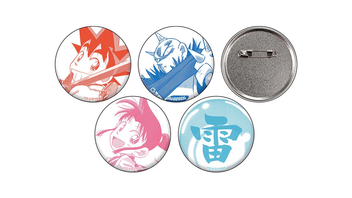 鉄 刃、峰 さやか、鬼丸 猛、雷神の玉をデザインした54㎜サイズの缶バッジ。ポリエステル製の布にシルク印刷したこだわりのアイテムです。 バッグやポーチにつけてお出かけするもオススメです。